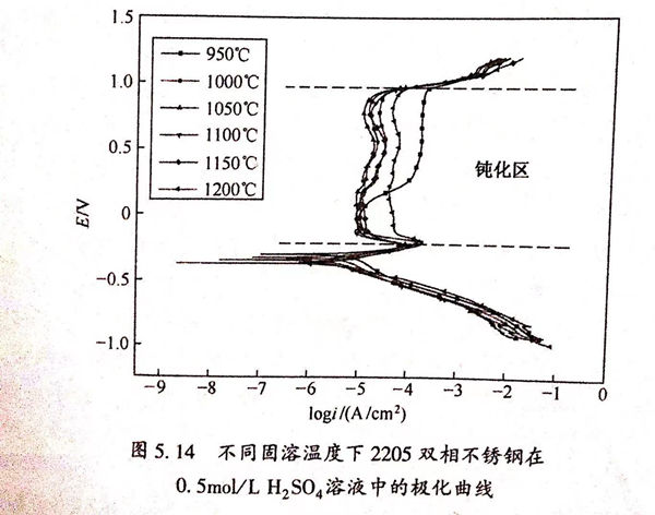 图5.14为不同固溶温度下2205双相不锈钢在0.5mol/L 硫酸溶液中的极化曲线,从图中可以看出,不同固溶温度下的试样极化曲线形状相似,在阳极区都有一个很宽的钝化区间,并且钝化区宽度基本相同,均在-0.2~0.9V之间。这是由于硫酸是一种氧化性酸,双相不锈钢中Cr元素含量较高,Cr元素不仅可以降低双相不锈钢钝化的难度,而且可以提高钝化膜的稳定性,因此,处于0.5mol/L 硫酸溶液环境中在阳极溶解的过程中会发生钝化。其具体拟合值如表5.5所列。