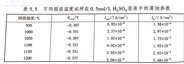 表5.5中Esorr代表自腐蚀电位,Icorr代表自腐蚀电流Ip代表维钝电流,自腐蚀电位只能代表材料的耐蚀倾向,而自腐蚀电流则可表示材料在溶液中的实际腐蚀速率。由表5.5中数据可知,不同固溶处理温度下试样的自腐蚀电位均在-0.4~-0.3V之间,自腐蚀电流大小均为10-6级别,这表明固溶温度对双相不锈钢在硫酸溶液中的耐蚀性能没有本质的改变,但是也有一些影响。当固溶温度为950℃时,自腐蚀电流为6.92×10-6(A/c㎡),为所有固溶温度试样的最大值;当固溶温度为1050℃时,自腐蚀电流为1.91×10-6(A/c㎡),为所有固溶温度试样的最小值。这表明,当固溶温度为1050℃时,2205双相不锈钢在0.5mol/L 硫酸溶液中耐蚀性能达到最佳;当温度为950℃时,由于σ相的影响,导致双相不锈钢耐蚀性能变差。