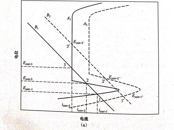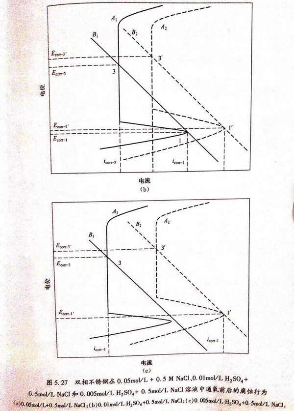 溶液中的氧含量对双相不锈钢在酸性NaCl溶液中的腐蚀行为的影响可以用图5.27来解释。氧对双相不锈钢腐蚀行为的影响与pH的影响效果基本一致。图5.27(a)可用来解释图5.23(a)的实验现象。当溶液中不含氧(氮气饱和)时,B1和A1分别代表理论的阴、阳极极化曲线。从图5.27中可以看出曲线有三个交点,即存在三个自腐蚀电位 ECOrr-1、Ecorr-2和Ecorr-3相对应的腐蚀电流密度为icorr-1、icorr-2和icorr-3.当有氧存在(空气饱和或氧饱和)时,阴、阳极极化曲线分别变为B2和A2,仍然有三个自腐蚀电位Ecorr-1'、Ecorr-2'和Ecorr-3',并且 Ecorr-1'>E corr-1、Ecorr-21>Ecorr-2、Ecorr-3'>Ecorr-3。图5.23(b)中在通氧前后都只有两个自腐蚀电位,这一现象可以用图5.27(b)来解释。当溶液中通入氧前,B1和A1分别代表理论的阴、阳极极化曲线,从图5.27中可以看出曲线有两个交点,即存在两个自腐蚀电位Ecorr-1和Ecorr-3,相对应的腐蚀电流密度为icorr-1和icorr-3。当有氧饱和时,阴、阳极极化曲线分别变为B2和A2,仍然有两个自腐蚀电位 Ecorr-1'和Ecorr-3'。通氧前后自腐蚀电位的关系为Ecorr-1'>Ecorr-1,Ecorr-3'>Ecorr-3.当硫酸浓度为0.005mol/L时,在极化曲线只有一个自腐蚀电位存在,但溶液经过氧饱和后,自腐蚀电位个数由一个增加为两个,这一现象可以用图5.27(c)来解释。空气饱和溶液中的理论阴、阳极极化曲线分别为B1和A1,从图5.27中可以看出只有一个交点,即只存在一个自腐蚀电位;当氧气饱和时,由于氧气促进了阴、阳极反应过程,使阴、阳极极化曲线到达B2和A2,此时曲线有两个交点,即出现两个自腐蚀电位。