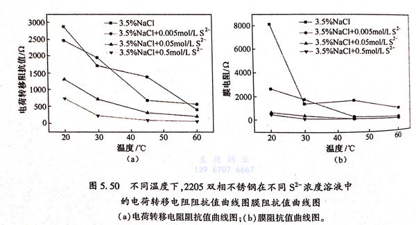 从图5.50(a)中可以看出,在相同的溶液中,随着溶液温度的升高,双相不锈钢在溶液中的电荷转移电阻阻抗值呈现下降的趋势,说明随着溶液温度的升高,电化学反应的阻力越来越小,腐蚀越容易发生。在相同的溶液温度下,随着S2-的引入,双相不锈钢电化学反应的电荷转移电阻的阻抗值呈现下降的趋势,并且溶液中的S2-浓度越高,双相不锈钢电化学反应的电荷转移电阻的阻抗值下降越明显,说明了S2-加快了腐蚀反应的速度,促进了腐蚀进一步发生。从图5.50(b)中可以看出,在相同的溶液中,随着溶液温度的升高,双相不锈钢在溶液中形成的表面钝化膜的膜阻抗值呈现下降的趋势,说明随着溶液温度的升高,表面钝化膜越来越不稳定。在相同的溶液温度下,随着S2-的引入,双相不锈钢在溶液中形成的表面钝化膜的膜阻抗值呈现下降的趋势,说明了S2-能够破坏钝化膜的稳定性,或者阻碍了钝化膜的形成。