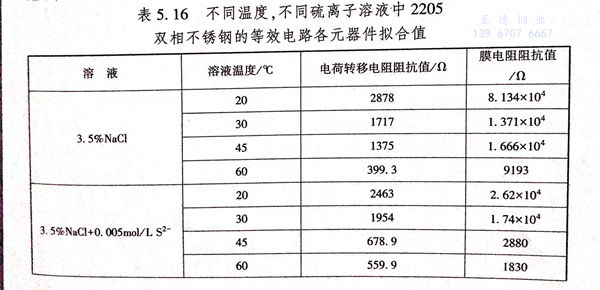 从表5.16中可以看出,在3.5%NaCl 溶液中,双相不锈钢的表面钝化膜的膜足抗值远远大于双相不锈钢发生电化学反应的电荷转移电阻狙抗值,说明在3.5%NaCl溶液中、双相不锈钢表面的钝化膜的性质决定了双相不锈钢的耐蚀性能。影响着腐浊速率的快慢、控制着电化学反应。从表5.16中可以看出、当溶液温度为20℃时,双相不锈钢的电荷转移电阻的阻抗值和钝化膜的阻抗值分别为2878Ω 134×104Ω 向3.5%NaCl溶液中加入S2-后,双相不锈钢电化学反应的电荷转移电阻的阻抗值分别下降至2463Ω 、1310Ω、736.2Ω,而钝化膜的固抗值分到下释至2.62×104Ω,6269Ω、4528Ω;当溶液温度为30℃时,双相不锈钢到电荷转移电阻的阻抗值和钝化膜的阻抗值分别为1717Ω、1.37×104Ω,向溶液中加入0.05m/L 和0.5ml/L S2-后,双相不锈钢的电荷转移电阻的阻抗值分到下降至79.3Ω,225.5Ω,而钝化膜的阻抗值分别下降至3676Ω、1118Ω:当溶液理度为45℃时,双相不锈钢的电荷转移电阻的阻抗值和钝化膜的阻抗值分到为 1375Ω、1.656×104Ω,向3.5%NaCl溶液中加入S2-后,双相不锈钢电化学支应的电荷转移电阻的阻抗值分别下降至678.9Ω,312.6Ω、89.51Ω、而钝化膜的阻抗值分别下降至2880Ω,1103Ω、1206Ω;当溶液温度为30℃时,双相不锈钢约电荷转移电阻的阻抗值和钝化膜的阻抗值分别为199.8Ω、9193Ω,向溶液中加入0.05mm/L和0.5mml/L.S2-后,双相不锈钢的电荷转移电限的阻抗值分别下降至719.3Ω,225.5Ω,而钝化膜的阻抗值分别下降至793.1Ω,546.4Ω.从以上分析可以看出,当S2-加入至3.5%NaCl溶液中后,双相不锈钢的纯化膜阻抗值称电莉转移电阻阻抗值都相应减小:但是,S2-使得钝化膜阳抗值减小的趋势更加明显,说明S2-主要通过破坏钝化膜的方式加速了双相不锈钢的腐蚀速率,降低了双相不锈钢的耐蚀性能。