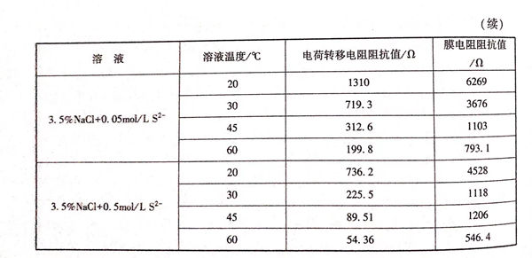 采用图5.49所示的等效电路图进行阻抗拟合,得到如图5.50和表5.16所示的等效电路中电荷转移电阻阻抗值和膜电阻阻抗值随溶液温度变化的关系图,以及不同温度下的电荷转移电阻阻抗值和膜电阻阻抗值的数值。