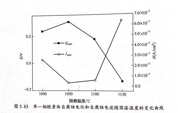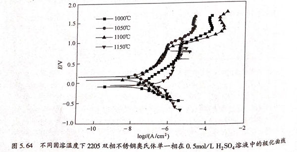 图5.64为不同固溶温度下2205 双相不锈钢奥氏体单一相在0.5mol/L 硫酸溶液中的极化曲线,奥氏体单一相极化曲线形状与铁素体单一相相似,均没有双相不锈钢整体在0.5mml/1.1,50,溶液中出现的法化钝化区以及很宽的纯化区间。当固溶温度较低时,剪氏体单一相极化曲线靠近图的左上方,随着固溶温度的升高,曲线向右下方移动,其具体批合数据如表5.20折列,自腐蚀电位和自腐蚀电流随温度的变化曲线如图5.65所示。