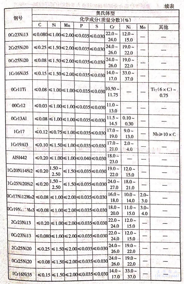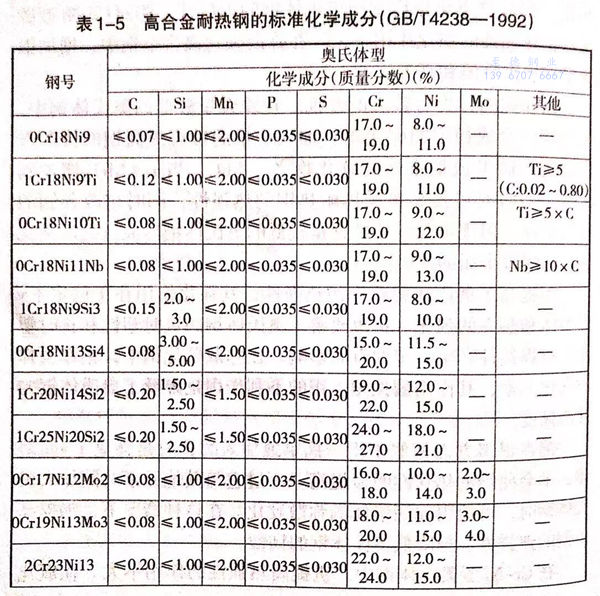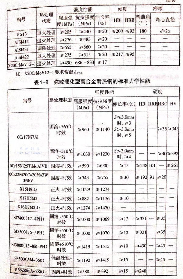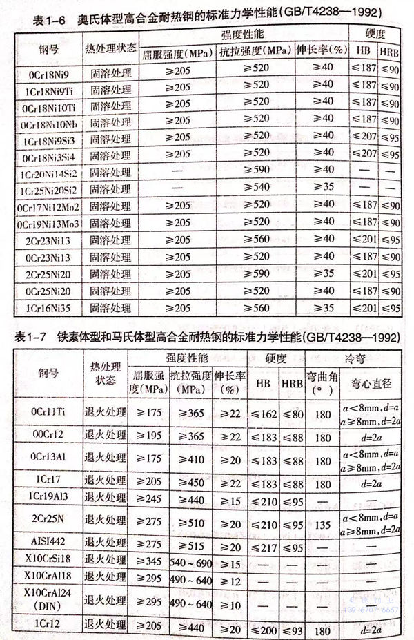 我国和世界主要工业国家常用的奥氏体型、铁素体型和马氏体型高合金耐热钢的标准化学成分列于表1-5。这些钢在供货状态下的力学性能分别列于表1-6、表1-7和表1-8。