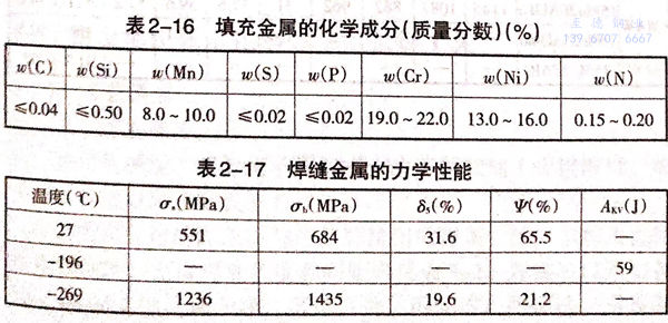 目前,0Cr21Ni6Mn9N钢的焊接还仅局限于TIG焊和真空电子束焊接。填充金属的化学成分见表2-16.焊缝金属的力学性能如表2-17所示。