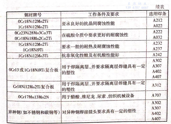 焊条应根据不锈钢的材质、工作条件(包括工作湿度和接触介质等)来选用,铬镍奥氏体不锈钢焊条的选用见表3-3。
