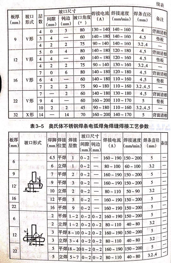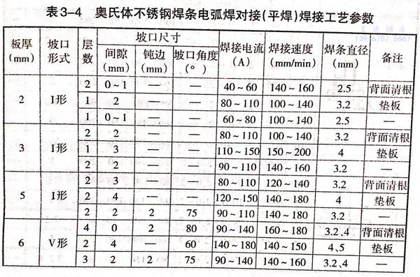 奥氏体不锈钢焊条电弧焊对接焊缝及角焊焊缝焊接工艺参数见表 3-4 和 表 3-5。