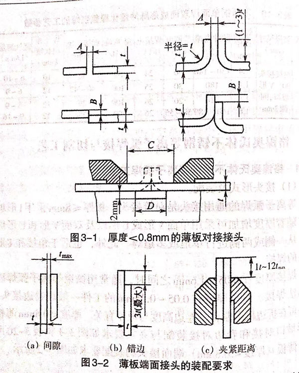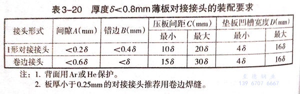 工件厚度小于1.6mm,采用微束等离子弧焊时,接头形式有:对接、卷边对接、卷边角接、端面接头。当厚度小于0.8mm时,接头装配要求列于表3-21。