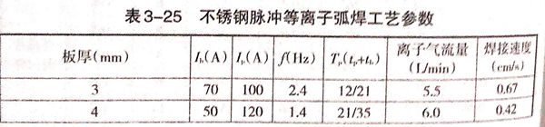 不锈钢脉冲等离子弧焊工艺参数见表3-25.