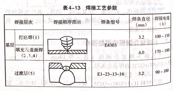 焊接材料:基层为E4303,直径ф3.2mm、ø4.0mm;过渡层为E1-23-13-16,ф3.2mm;覆层为E0-19-10Nb-16,Φ3.2mm。