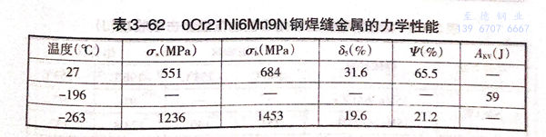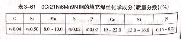 目前,0Cr21Ni6Mn9N钢的焊接还仅限于TIG焊及真空电子束焊接。焊接参数可参照不锈钢。填充焊丝的化学成分见表3-61.焊缝金属的力学性能见表3-62。