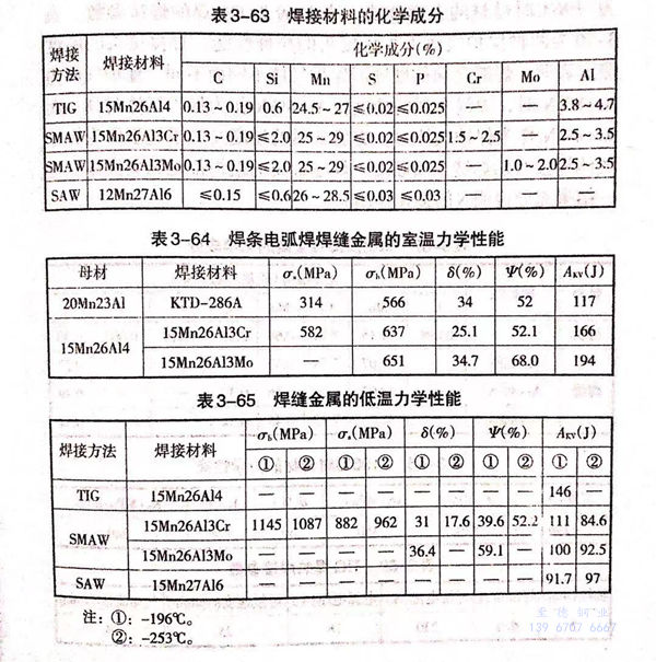 15Mn26Al14钢可用SWAM、SAW及TIG方法焊接,其所用焊接材料及力学性能在表3-63~表3-66中给出。
