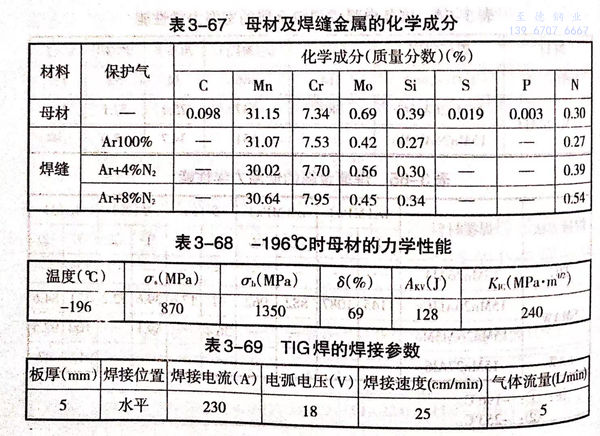 采用TIG焊法,保护气体用纯氩气或氩气+氮气,填充焊丝直径4mm.母材及焊缝金属的化学成分在表3-67中给出。表3-68为-196℃时母材的力学性能。表3-69为TIG焊的焊接参数。表3-70为两种保护气体下焊接接头的拉伸性能。焊接接头的硬度测定表明,焊缝金属的硬度因保护气体不同而不同。保护气体为Ar+8%N2时,焊缝金属的硬度比Ar+4%N2作为保护气体时高;而Ar+4%N2作为保护气体时,焊缝金属的硬度又高于纯氩作为保护气体焊接时的焊缝金属硬度。焊缝金属的组织都是纯奥氏体,这一结果充分说明N的强化作用。