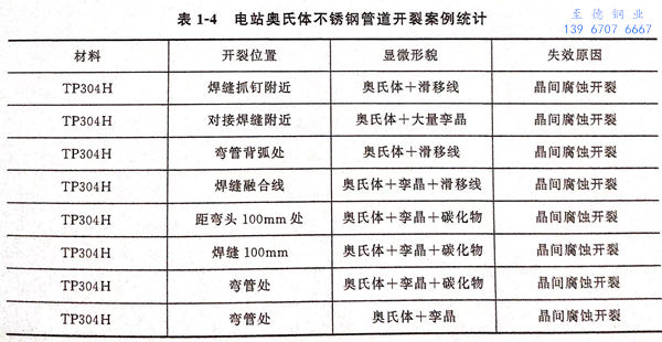 晶间腐蚀是一种危害性极大的局部腐蚀形式,其特点是腐蚀沿着金属内部晶界面扩展。晶间腐蚀破坏了晶粒之间的结合力,使金属的强度大大降低,承受应力的能力极弱。晶间腐蚀具有极大的隐蔽性,当金属发生晶间腐蚀时,金属外观仍然有一定光泽,肉眼很难观察到,但是只要轻微敲击腐蚀处,材料就发生碎裂。晶间腐蚀产生的原因主要是由于在金属处理过程中造成晶粒表面和内部化学成分的不均匀,或者晶界存在夹杂物或应力,造成电化学腐蚀。到目前为止,晶间腐蚀依然是奥氏体不锈钢工程应用中没有解决的难题,特别是对于不锈钢焊接件,焊缝处易产生“贫铬”现象,从而引起晶间腐蚀。文献作者对某地区电站奥氏体不锈钢管道开裂进行了调查研究,结果如表1-4所示,开裂位置主要发生在焊接及弯管处。腐蚀微观形貌如图1-12所示,图1-12(a)中有较粗的裂纹,该裂纹没有分支,与应力腐蚀裂纹明显不同;图1-12(b)中不存在裂纹,但晶粒之间已完全被腐蚀。
