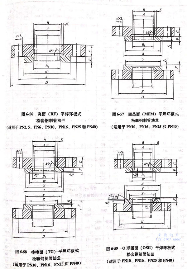用PN标记的平焊环板式松套钢制管法兰的密封面型式及适用的公称压力和公称尺寸范围见表6-124;用PN标记的平焊环板式松套钢制管法兰的型式如图6-56~图6-59所示,法兰密封面尺寸见表6-125,法兰的结构尺寸见表6-126~表6-131。