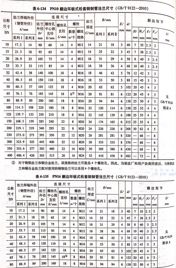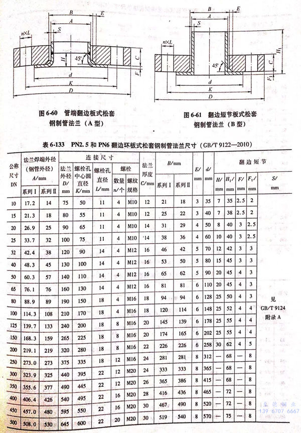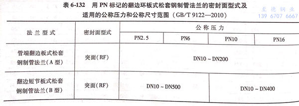 翻边环板式松套法兰包括用PN标记的管端翻边板式松套钢制管法兰(A型)和翻边短节板式松套钢制管法兰(B型)两类,其密封面型式及适用的公称压力和公称尺寸范围见表6-132;用PN标记的翻边环板式松套钢制管法兰的型式如图6-60~图6-61所示,法兰结构尺寸或尺寸见表6-133~表6-135。