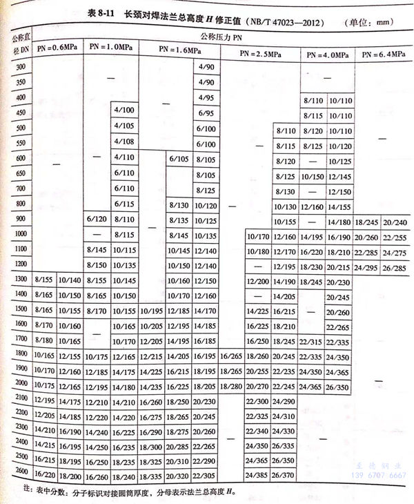 8. 长颈对焊法兰总高度H修正值见表 8-11 。