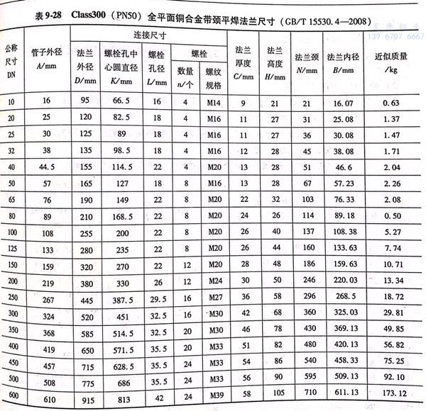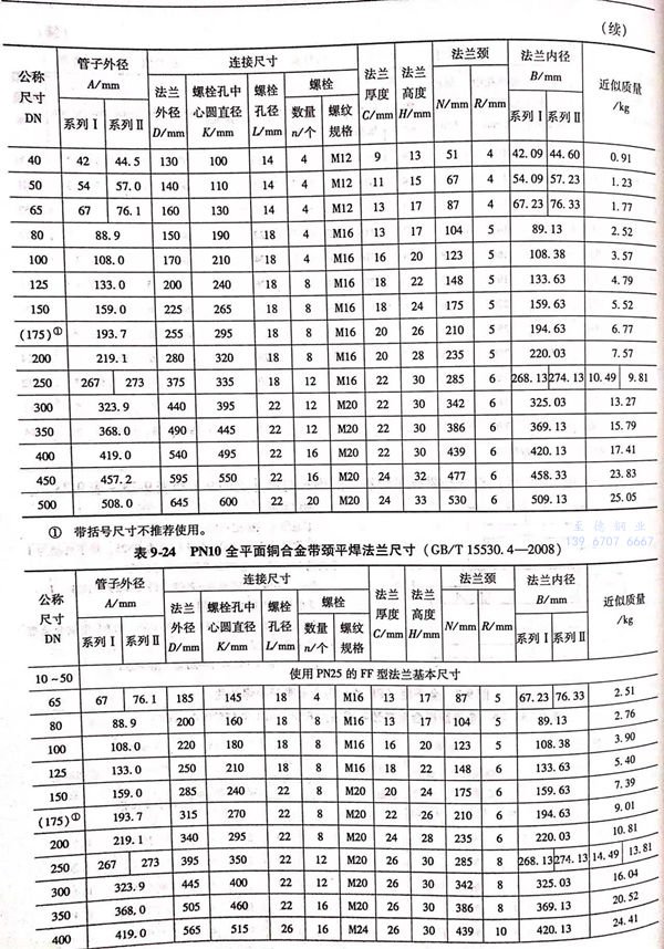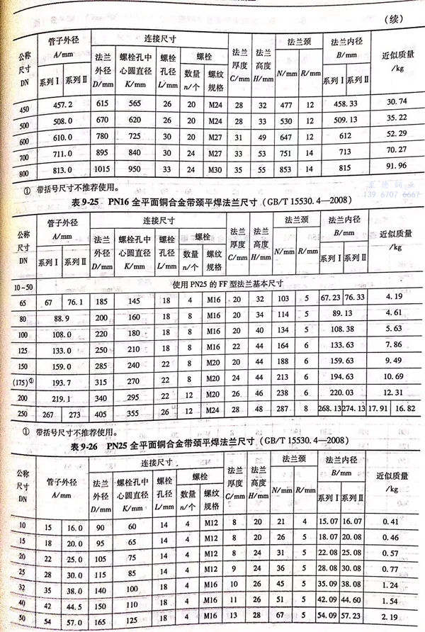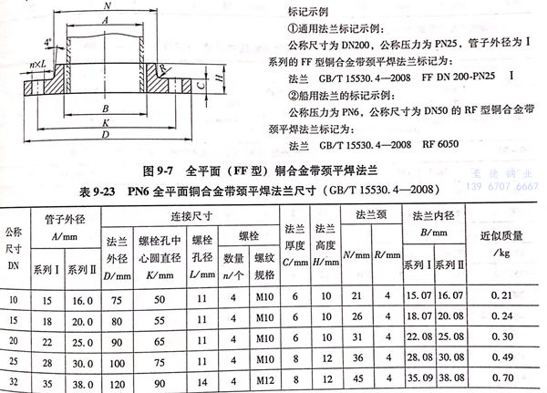 全平面(FF型)铜合金带颈平焊法兰的型式与尺寸见图 9-7 和表 9-23~表 9-28。