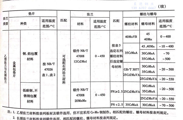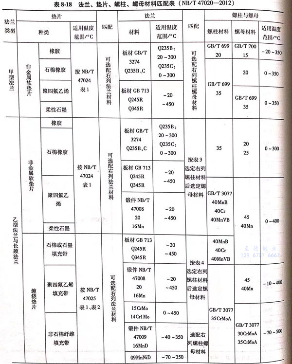 甲型平焊法兰、乙型平焊法兰和长颈对焊法兰(以下简称甲型、乙型、长颈法兰)与垫片、螺柱与螺母材料的匹配(含适用温度范围)见表8-18。