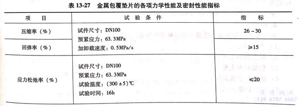 金属包覆垫片的各项力学性能及密封性能指标见表13-27.