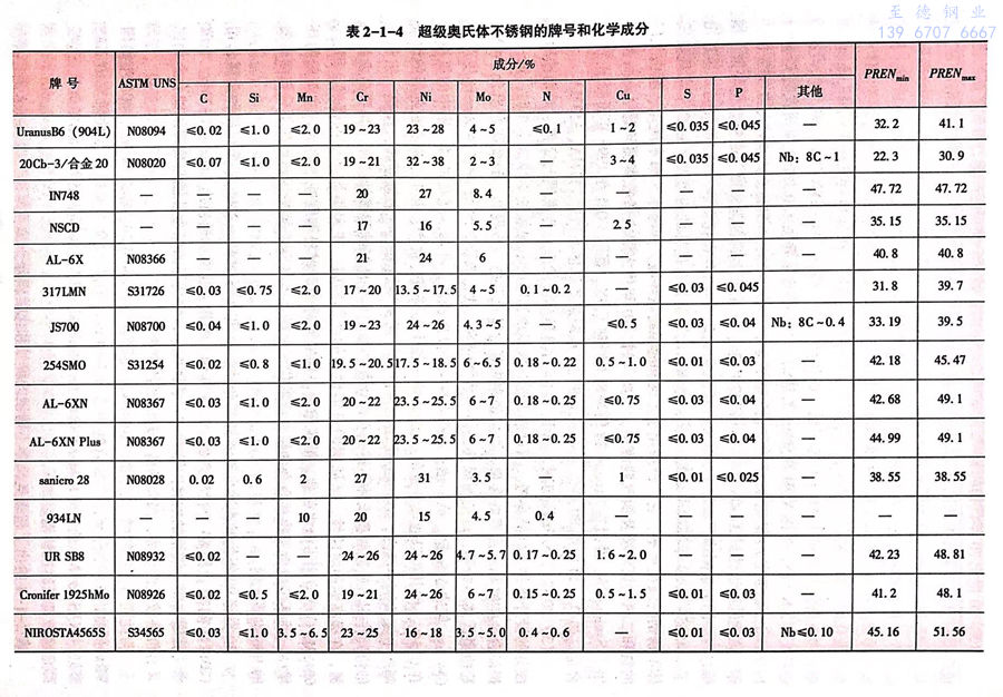 表2-1-4给出了超级奥氏体不锈钢的牌号和化学成分。