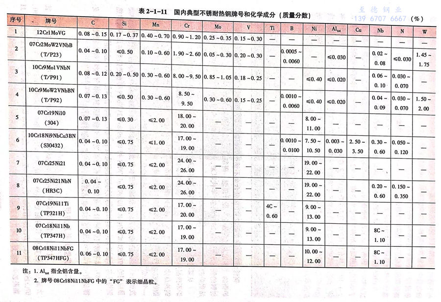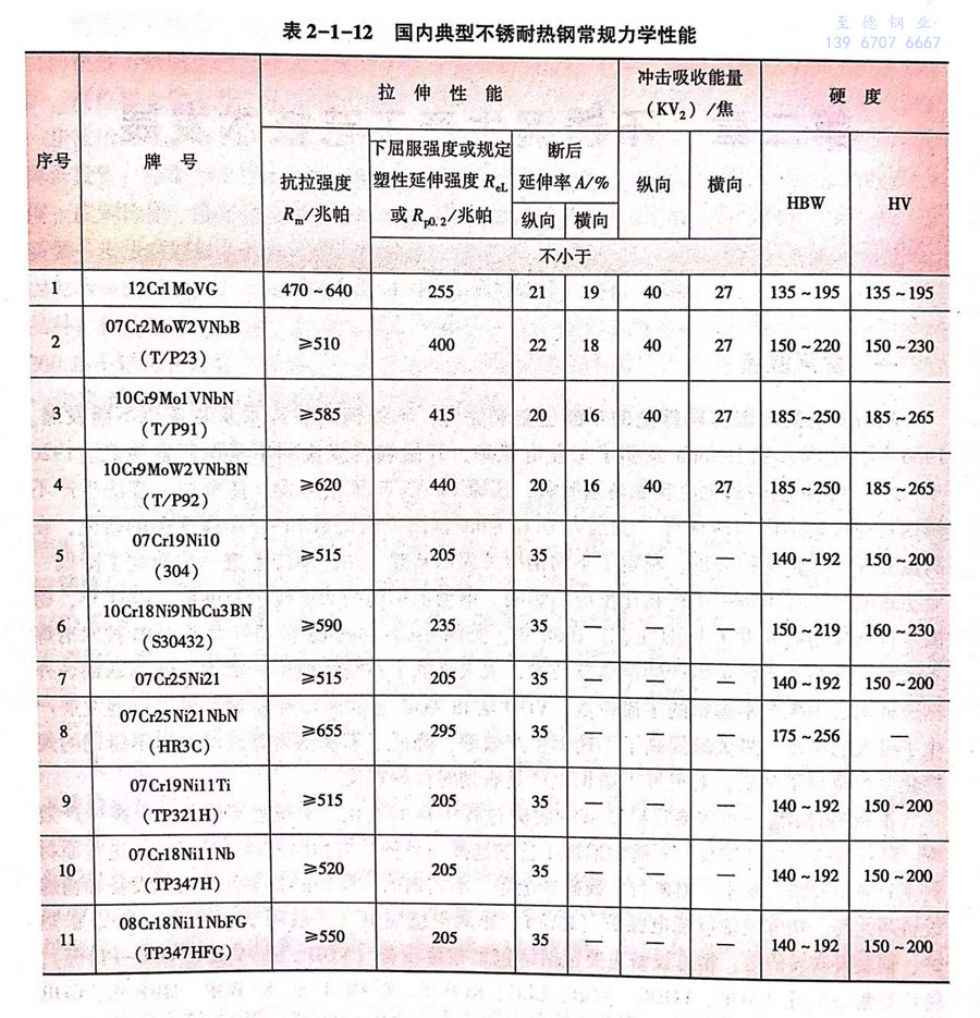 迄今,世界上最先进的商用超超临界电站蒸汽温度为600℃(二次再热温度620℃),其大量应用的典型不锈耐热钢牌号有 10C19Mo1VNbN、10Cr9MoW2VNbBN、07Cr19Ni10、07Cr25Ni21NbN、07Cr18Ni11Nb等,其典型成分范围和常规力学性能要求分别见表2-1-11和表2-1-12。