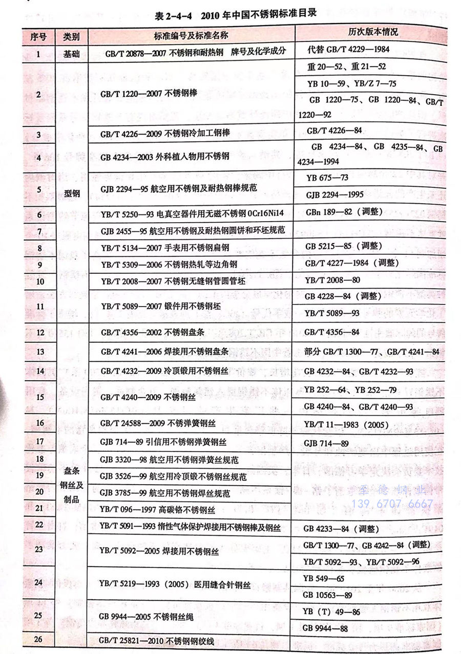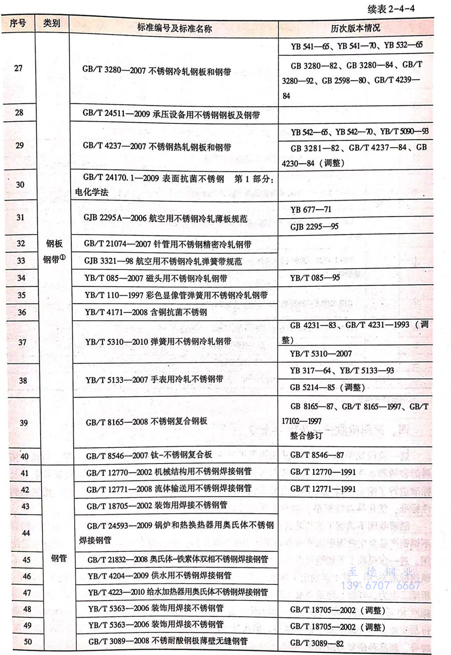 从2000年至2010年,我国共制修订不锈钢标准46项,其中新制定了《奥氏体-铁素体双相不锈钢无缝钢管》《承压设备用不锈钢钢板及钢带》《含铜抗菌不锈钢》等14项(国家标准9项,国家军用标准1项,行业标准4项),将《不锈钢热轧等边角钢》等3项国家标准调整为行业标准,标准总数共63项(见表2-4-4)。