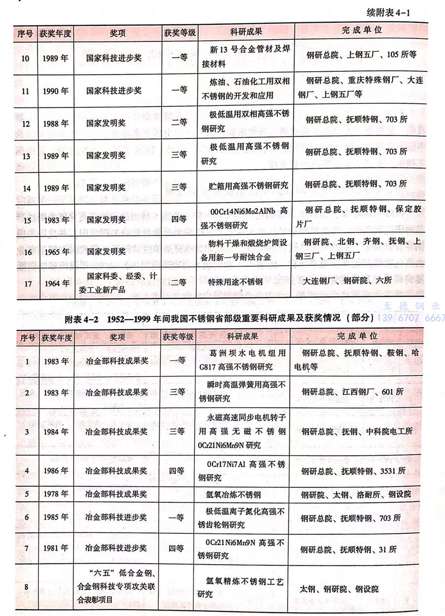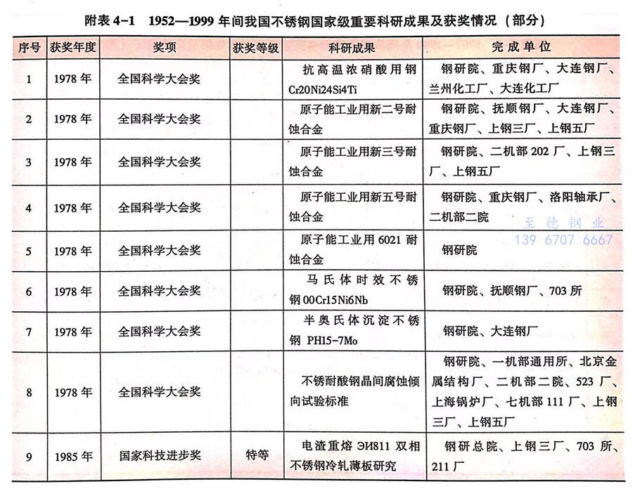 1952-1999年,是我国不锈钢的开端与创业期。我国不锈钢的发展一直伴随着钢铁产品的研究和创新。作为我国最早开展不锈钢和高镍耐蚀合金研究和工程应用,并建立不锈钢专业研究组、室的科研单位,钢铁研究总院和其他兄弟单位共同见证了我国不锈钢事业由消化吸收到创新的艰辛历程。附表4-1和附表4-2展示了1952-1999年我国不锈钢重要科研成果及获奖情况(部分)。
