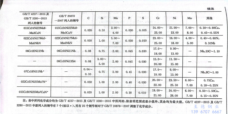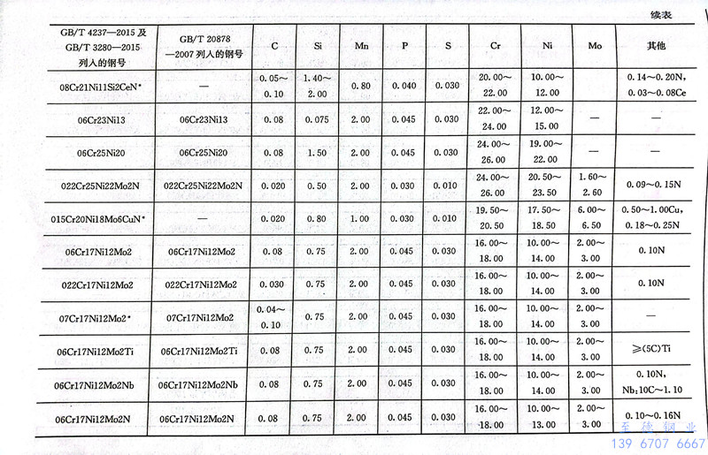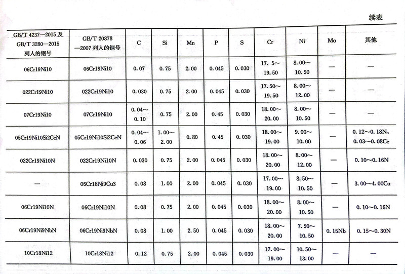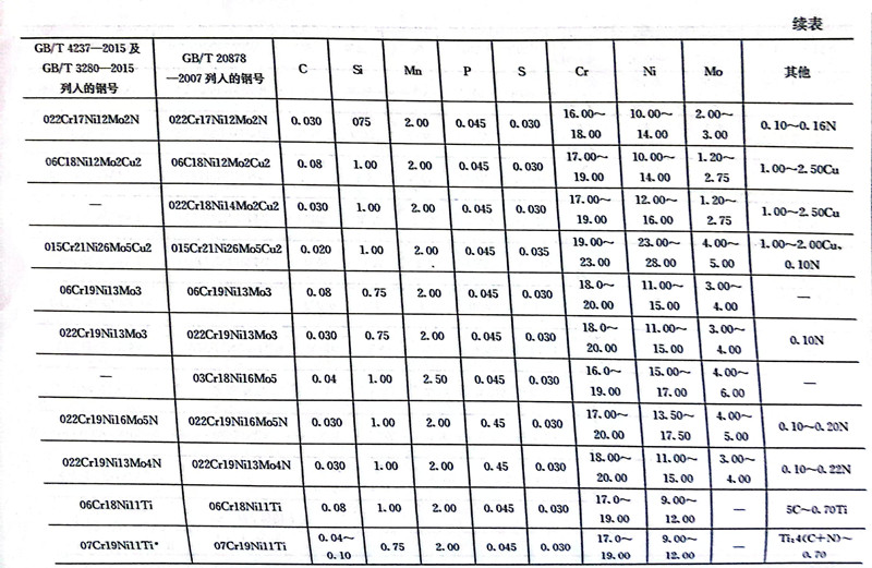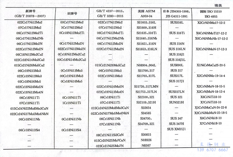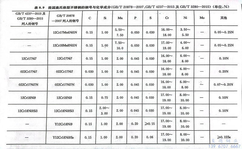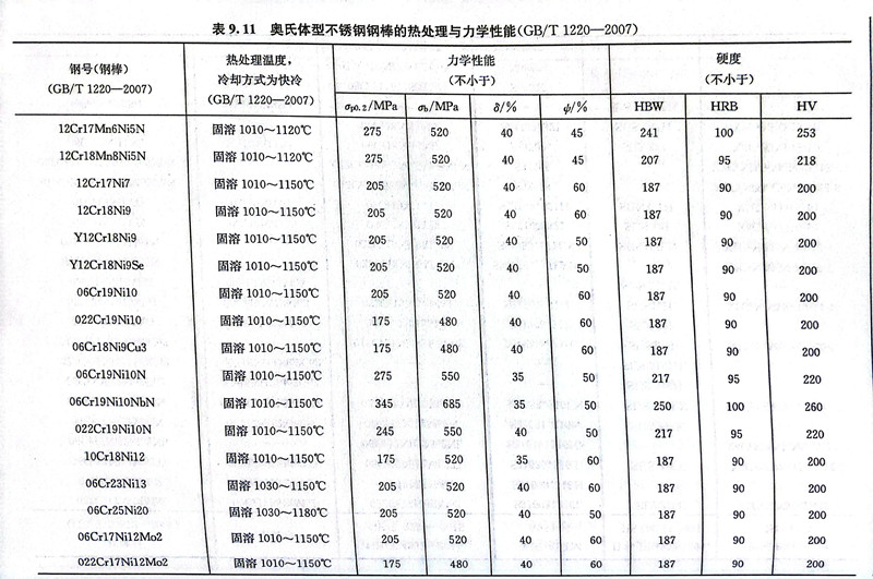 在GB/T 20878-2007中列入了42个奥氏体型不锈钢的牌号。在新修订的GB/T 4237-2015及GB/T 3280-2015中列人的奥氏体型不锈钢的牌号有39个,有7个是新加入的,其中5个是GB/T 20878-2007中未列入的。表9.9为GB/T 20878-2007、GB/T 4237-2015及GB/T 3280-2015中列入的我国奥氏体型不锈钢的钢号及其化学成分。表9.10为我国奥氏体型不锈钢新旧牌号和相应美国、日本和国际标准牌号的对照。表9.11为奥氏体型不锈钢钢棒的热处理与力学性能。表9.12为奥氏体型不锈钢钢板和钢带热处理后的力学性能。