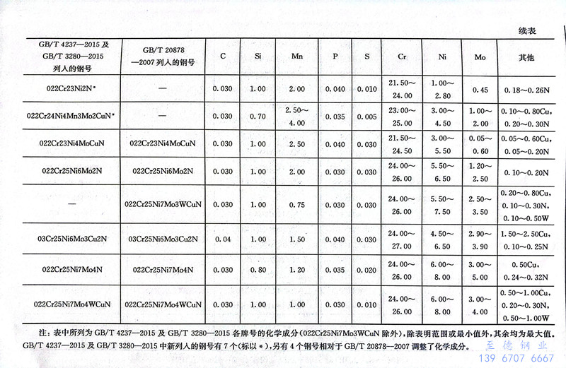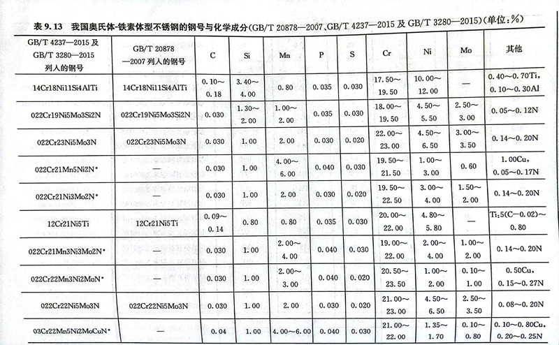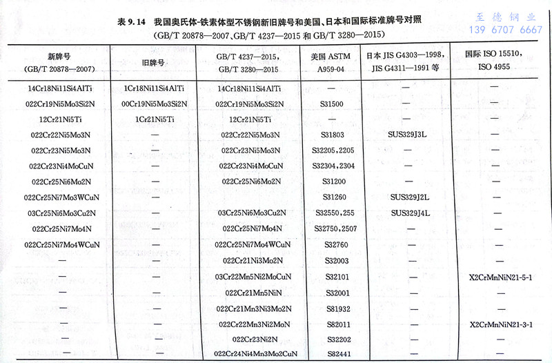 在GB/T 20878-2007中列入了11个奥氏体-铁素体型双相不锈钢的牌号,表9.13为这些奥氏体-铁素体型不锈钢和GB/T 4237-2015 及 GB/T 3280-2015中列入的奥氏体-铁素体型双相不锈钢的钢号与化学成分。表9.14为我国奥氏体-铁素体型双相不锈钢新旧牌号和相应美国、日本和国际标准牌号的对照。表9.15为奥氏体-铁素体型双相不锈钢的热处理与力学性能。