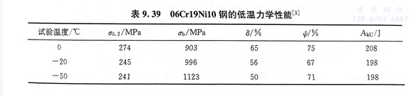 06Cr19Ni10、304不锈钢是不锈钢的主要钢种,其产量约占不锈钢产量的30%以上。该钢可以通过冷变形的方式提高强度,固溶态及冷变形H1/4和H1/2状态的力学性能见表9.12、表9.34及表9.35。由图9.74可以看出冷变形对06Cr19Ni10钢力学性能的影响。表9.39为06Cr19Ni10钢的低温力学性能。