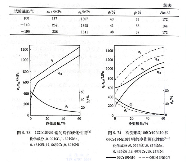 12Cr18Ni9、302不锈钢是历史最悠久的奥氏体不锈钢,在固溶态具有良好的塑性、韧性和冷加工性能,但其硬化效果不如1Cr17Ni7钢,如图9.73所示。这是由于镍含量的增加使奥氏体趋于稳定,冷变形时转变为马氏体的量趋于减少之故。该钢固溶态及不同程度冷变形后的力学性能见表9.12及表9.34~表9.37。