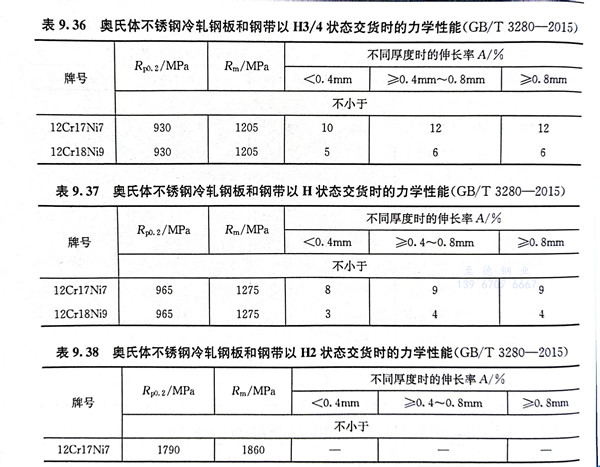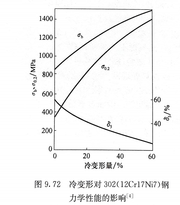 12Cr17Ni7钢是一种亚稳奥氏体不锈钢,在固溶状态具有完全的奥氏体组织,易于冷变形强化。在冷变形过程中,会有一部分转变为马氏体,转变量的大小取决于变形量的大小,从而显著提高钢的强度,塑性相应降低(图9.72)。该钢固溶态及不同程度冷变形后的力学性能见表9.12及表9.34~表9.38。