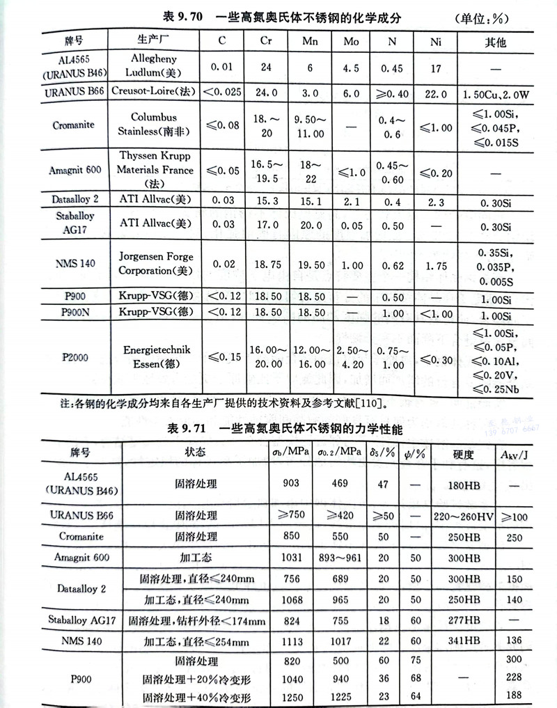 表9.70和表9.71分别列出了一些典型高氮奥氏体不锈钢的化学成分及其力学性能。