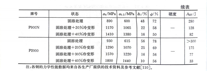 P900、P900N钢制造工艺如下:经加压电渣重熔的钢,先进行热锻,再进行热冲孔,对锻后的毛坯进行粗加工,固溶处理,在6000t的压力机上进行冷扩以达到要求的冷变形量,进行消除应力的热处理,精加工。P900、P900N钢经上述工艺处理后的力学性能见表9.71。P900、P900N钢在潮湿的条件下工作可以避免应力腐蚀开裂。