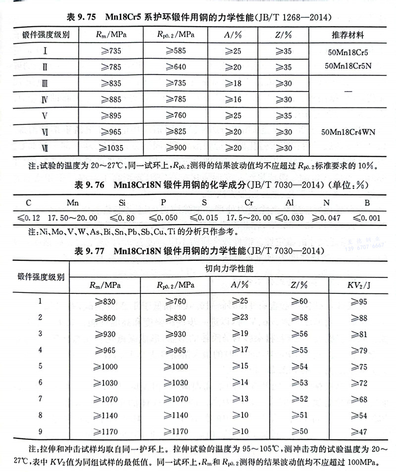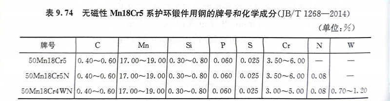 表9.74为无磁性护环用Mn18Cr5系锻件用钢的牌号和化学成分。表9.75为Mn18Cr5系锻件用钢的强度级别。