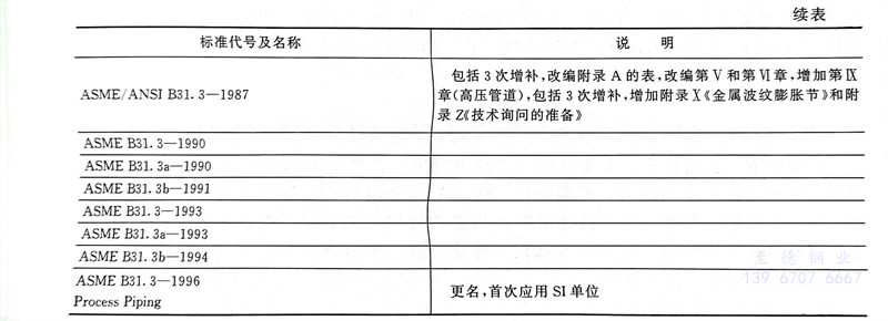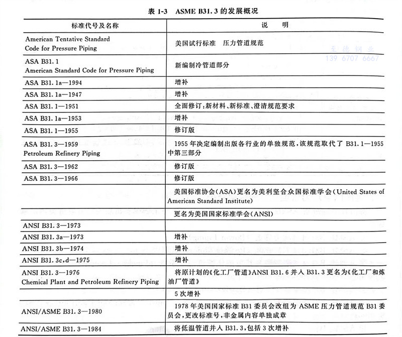 由于1967~1969年美国标准协会(ASA)先改名为美利坚合众国标准学会(USAS),后又改名为美国国家标准学会(ANSI),故1973年标准代号改为ANSI B31.3。1976年因并入了化工厂管道内容而更名为《化工厂和炼油厂管道》。1978年美国国家标准B31委员会改组为 ASME压力管道规范B31委员会,自1980年后各版标准分别以ANSI/ASMEB31.3,ASME/ANSI B31.3和ASME B31.3代号出版,1996年版更名为ASME B31.3《工艺管道》,一直沿用到现在的最新版ASME B31.3,其发展概况见表1-3。