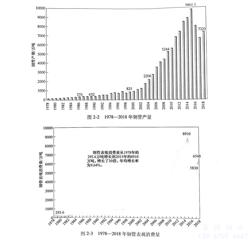 从新中国成立到改革开放近30年,我国不锈钢管的生产装备落后,产量低,质量差,完全不能满足国内建设和发展的需要,每年需花大量的外汇从国外购买钢管。随着改革开放打开国门,进入80年代后我国陆续从欧美大规模地引进先进的技术设备,大大地改变了我国不锈钢管生产装备的落后局面,使我国钢管产量从稳步发展走上了快速增长之路。从1978年的168.2万吨,到1986年不锈钢管产量达到375.4万吨,超过了美国;1990年达到431.9万吨,超过了德国;1999年达到852万吨,超过了日本,成为世界钢管生产第一大国。特别是从2000年到2015年的15年间,我国不锈钢管行业的产能及产量得到了飞速发展,2004年,中国不锈钢管产量达到2207万吨,超过了世界不锈钢管历史上苏联1988年所保持的2084万吨纪录,2015年我国不锈钢管产量达到9801.8万吨的峰值,见图2-1,占世界钢管产量65%。这段时间钢管产量的年均增长率为17%。从1978年的168.2万吨增长到2015年的9801.8万吨,不锈钢管产量增长了58倍,年均增长率为11.61%。钢管表观消费量从1978年的295.6万吨增长到2015年的8910万吨,见图2-2,增长了30倍,年均增长率为9.64%。