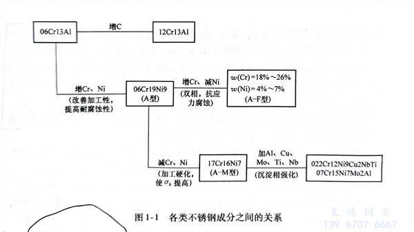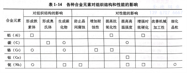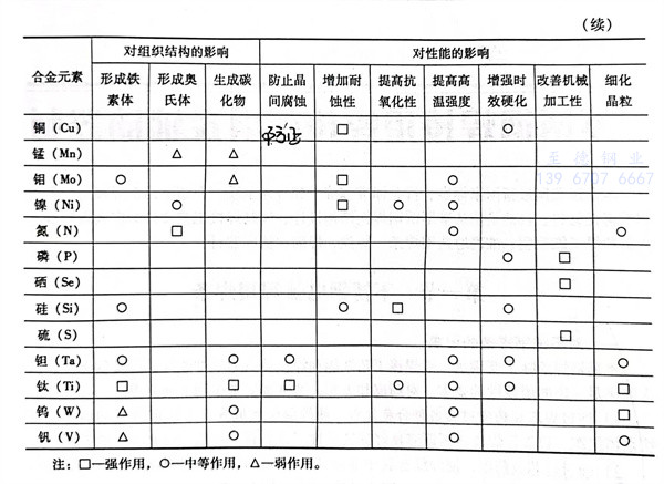 上述合金元素对钢的作用不是简单的叠加,也不是相互抵消的。它们相互之间有时会发生新的物理化学作用,往往会引起强化力学性能的作用。各种合金元素对不锈钢组织结构和性能的影响见表1-14,亦可见图1-1、图1-2。从表中可以看出,合金元素对不锈钢组织的影响基本上分三大类:第一类是形成铁素体的元素,有铬、硅、铝、钼、钛、铌等;第二类是形成奥氏体的元素,有碳、氮、镍、锰、铜等,其中碳和氮的作用程度最大;第三类是形成碳化物的元素,有铌、钛、碳、铬、钨、锰、钼等。加入铜、铝、钛、铌、氮等元素能促使钢产生弥散硬化,从而提高钢的热强性。
