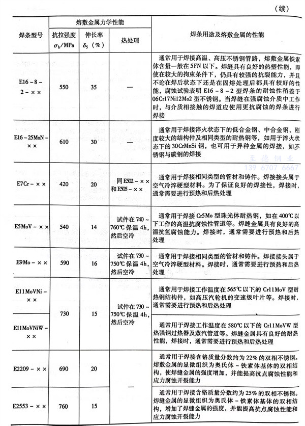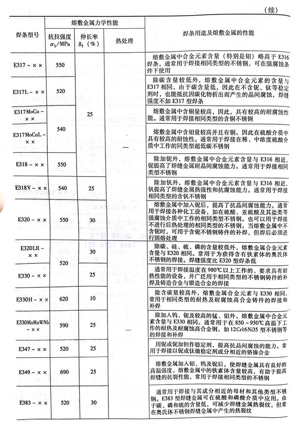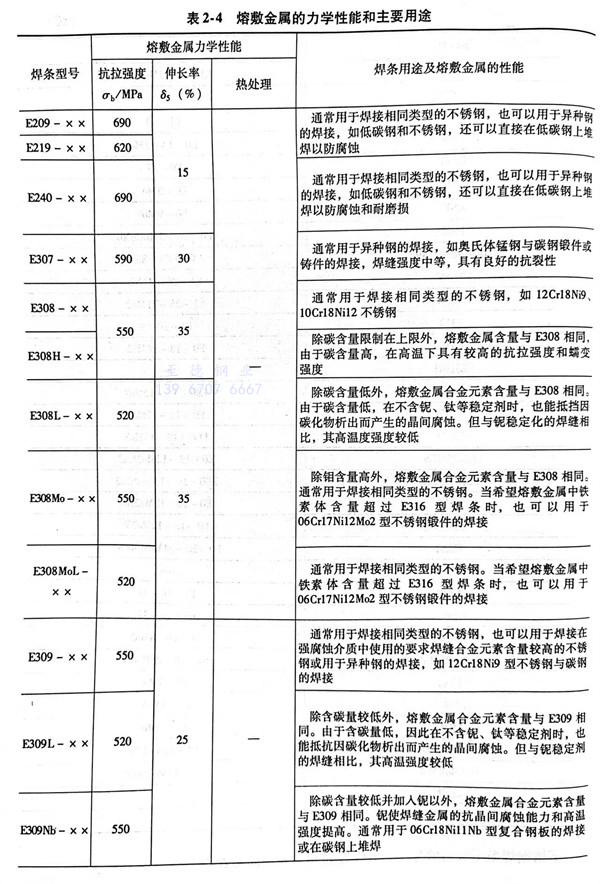 不锈钢焊条型号熔敷金属的力学性能和主要用途