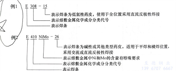 不锈钢焊条的牌号是指制造商对作为产品出厂的每种焊条标识的特定编号,用来区别不同焊条熔敷金属的化学成分、力学性能、药皮类型和焊接电流种类。我国生产不锈钢焊条的厂家很多,它们使用统一牌号,其表示方法为: