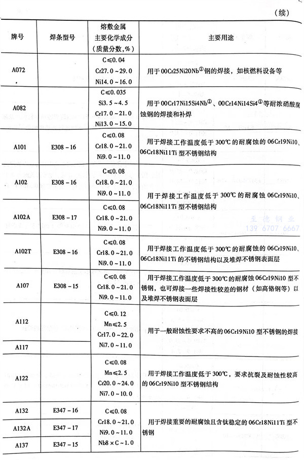 各种牌号不锈钢焊条及其主要用途