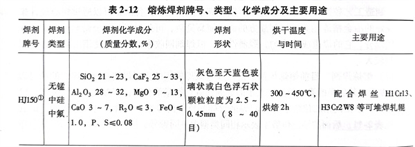 熔炼焊剂的牌号、类型、化学成分及主要用途见表 2-12