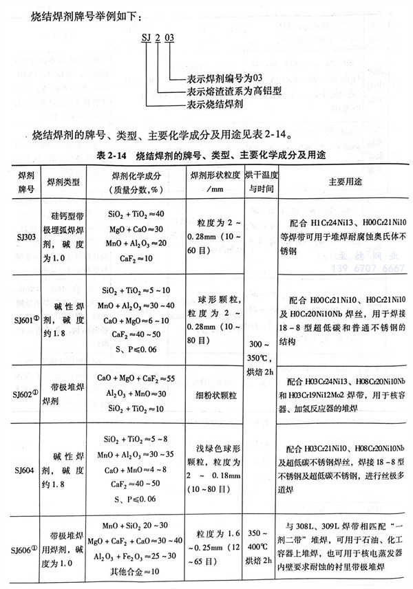 烧结焊剂的牌号、类型、化学成分及主要用途见表 2-14