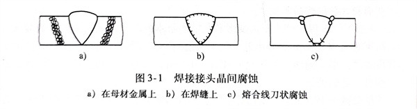 在18-8型不锈钢的焊缝金属中渗入稳定化合金元素钛、铌、锆等,可以消除图3-1a和图3-1b两种形式的晶间腐蚀,但又可能会出现如图3-1c中的腐蚀现象,即顺着焊缝金属的熔合线发生像刀切一样的腐蚀,称它为刀状腐蚀。刀状腐蚀是顺着焊缝熔合线向板厚度方向深人,并慢慢地向母材金属和焊缝金属发展,如图3-3所示。刀状腐蚀将成为制约焊接结构使用寿命的薄弱环节。
