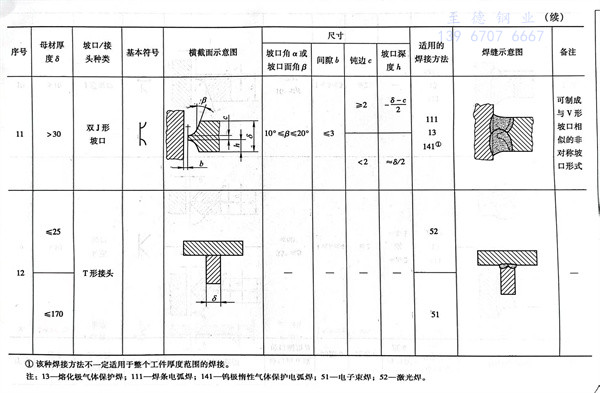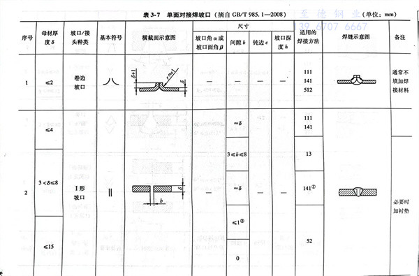 根据不锈钢钢板厚度,常用的电弧焊单面焊对接坡口见表3-7(GB/T 985.1-2008)和双面对接焊坡口见表3-8(GB/T985.1-2008)。这两种坡口形式也是全国压力容器标准化技术委员会推荐在压力容器及压力元件中使用的。