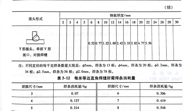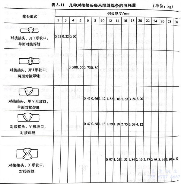 几种对接接头每米焊缝所消耗焊条的质量见表3-11。表3-12为等边直角焊缝每米所消耗焊条的质量。