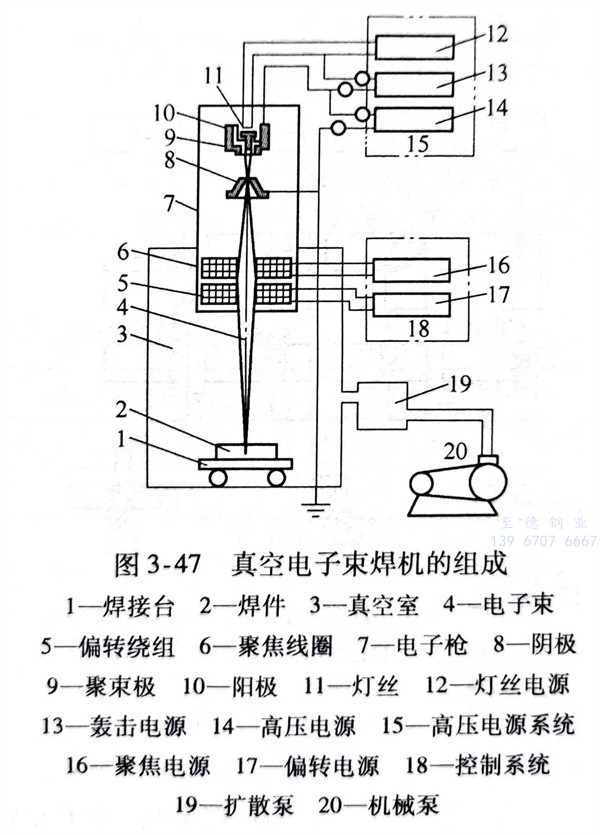 真空电子束焊机的组成如图3-47。电子束焊机的分类见表3-45。不论焊接环境压强高低,电子束均是在高真空度条件下获得的。