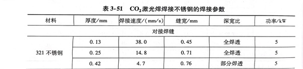 用激光焊焊接奥氏体型不锈钢板,从薄板到中厚度板(0.1~12mm),均可达到性能良好且焊接接头外观和成形美观的效果。表3-51为二氧化碳激光焊焊接不锈钢的焊接参数。