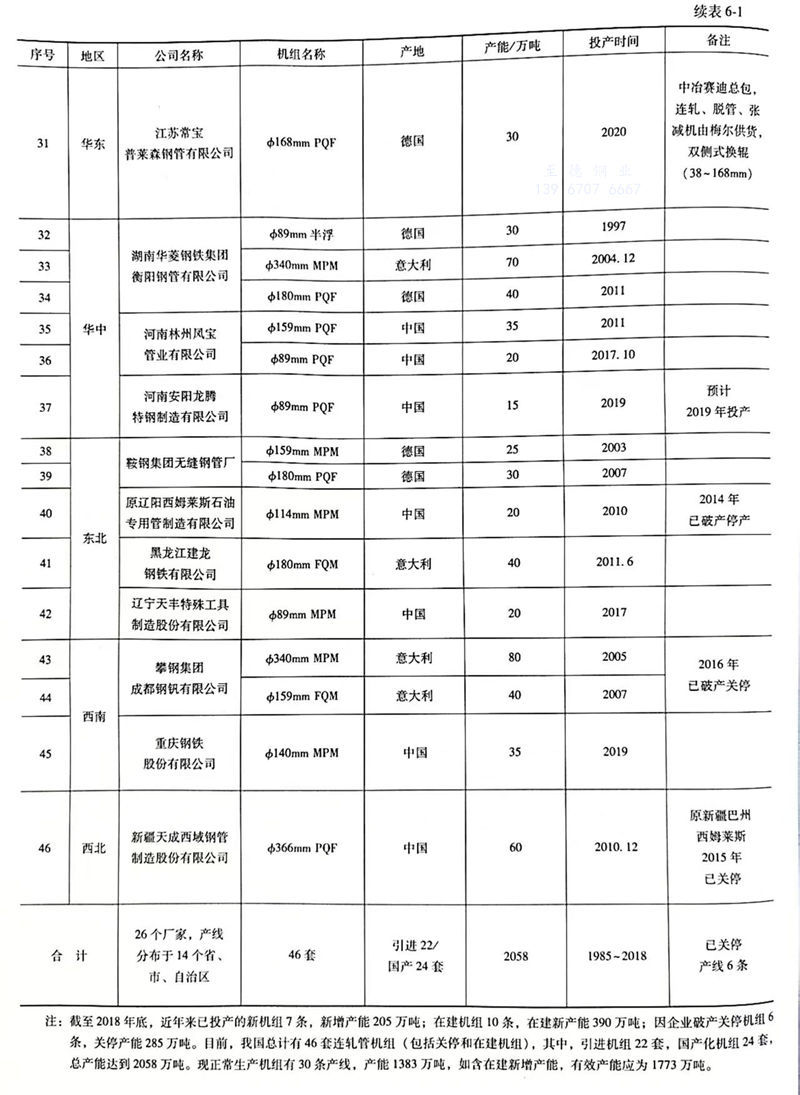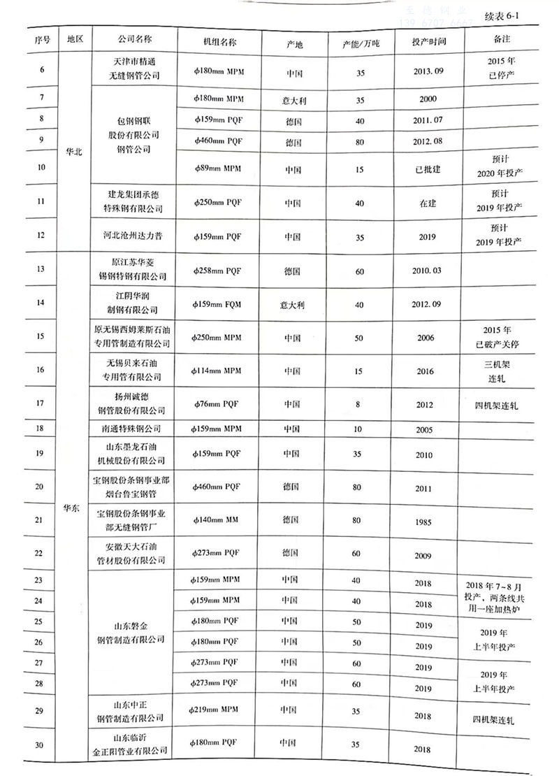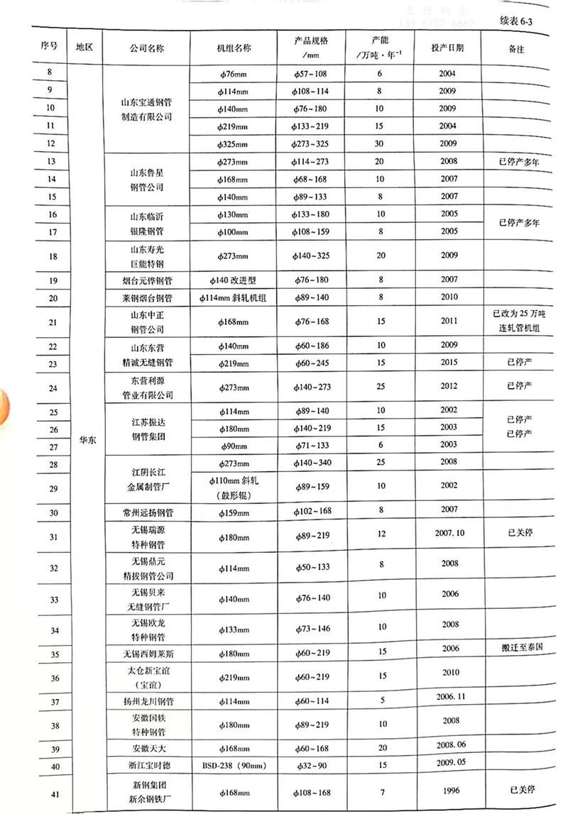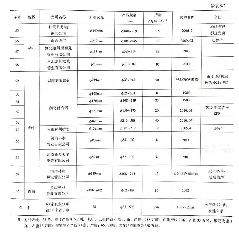据不完全统计,截至2018年底我国已拥有各类热轧无缝钢管完整的生产线(连轧管、精密/斜轧管、三辊轧管、自动轧管、顶管、挤压管、周期轧管等)达239条,产能规模突破4500万吨,为4519万吨。近年来由于淘汰落后产能和部分企业停产或破产,使部分机组关、停或拆除,现实际产能为3574万吨,占全国无缝钢管产能比重87.73%;另外,还有φ90mm及以下穿孔/冷拔(轧)无缝钢管生产线约220条,产能约500万吨,占全国无缝钢管产能比重12.27%;热轧无缝钢管机组数量加穿孔+冷轧/拔线数量,总计约459套(台),产能约5019万吨,去除关、停、拆机组的产能945万吨,我国无缝钢管实际产能约4074万吨(含在建机组产能)。